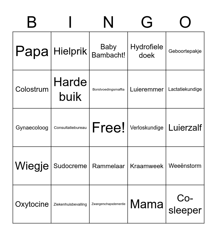 This bingo card has a free space and 75 words: Autostoel, Baarkruk, Baby Bambacht!, Babyfoon, Babyslofjes, Badbevalling, Bandenpijn, Bekkeninstabiliteit, Beschuit met muisjes, Bevalling, Billendoekjes, Borstkolf, Borstvoedingsmaffia, Colostrum, Commode, Consultatiebureau, Cord-ring, Co-sleeper, Fles, Geboortepakje, Geboorteplan, Gynaecoloog, Harde buik, Hielprik, Hydrofiele doek, Indalen, Isofix, Kinderstoel, Kinderwagen, Kraamsuite, Kraamtranen, Kraamverband, Kraamverzorgster, Kraamweek, Lactatiekundige, Luieremmer, Luiers, Luiertas, Luierzalf, Mama, Maxicosi, Meconium, Moederkoek, Moedermaffia, Muziekmobiel, Navelklem, Oxytocine, Papa, Perineum, Placenta, Prematuur, Rammelaar, Reflux, Romper, Speen, Speenkoord, Spruw, Sterrenkijker, Strippen, Stuitligging, Sudocreme, Tepelhoedje, Toucheren, TummyTub, Verlof, Verloskundige, Vernix, Vluchttas, Voedingsbeha, Weeënstorm, Wiegje, Ziekenhuisbevalling, Zoogkompres, Zwangerschapsdementie and Zwangerschapsmasker.