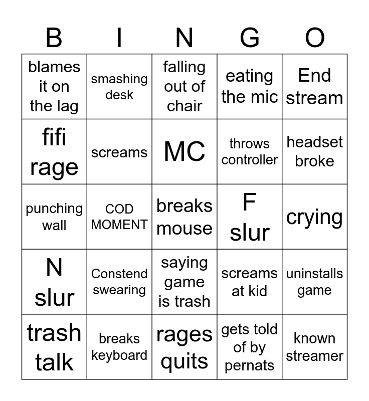 This bingo card has a free space and 24 words: Constend swearing, breaks keyboard, MC, trash talk, End stream, blames it on the lag, fifi rage, smashing desk, F slur, saying game is trash, throws controller, punching wall, screams at kid, uninstalls game, screams, gets told of by pernats, crying, falling out of chair, headset broke, COD MOMENT, known streamer, N slur, eating the mic and rages quits.