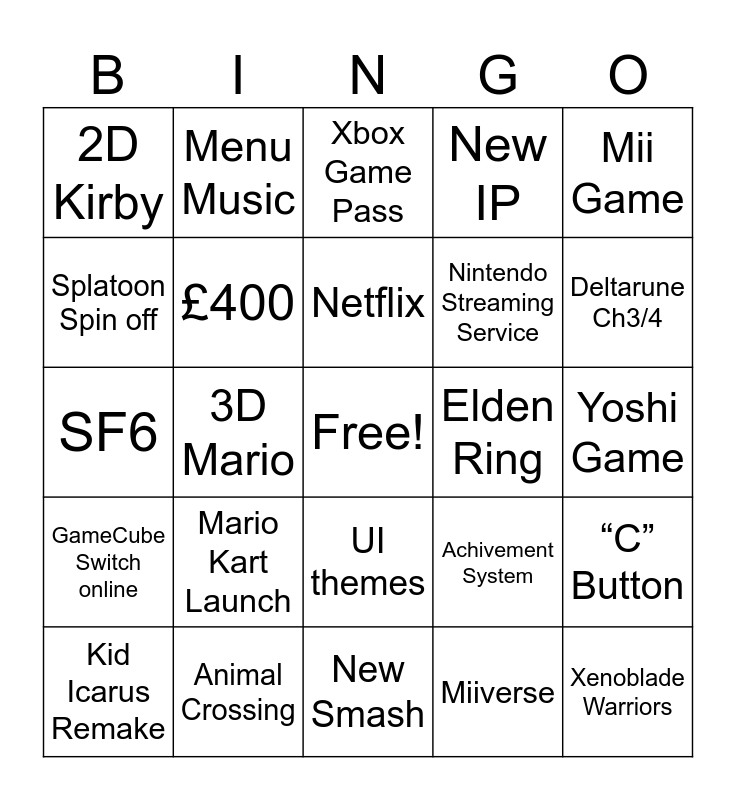 This bingo card has a free space and 24 words: Mario Kart Launch, Animal Crossing, Netflix, Kid Icarus Remake, Mii Game, 2D Kirby, Splatoon Spin off, Menu Music, Elden Ring, UI themes, Nintendo Streaming Service, SF6, Achivement System, “C” Button, £400, Miiverse, Yoshi Game, Xbox Game Pass, Deltarune Ch3/4, 3D Mario, Xenoblade Warriors, GameCube Switch online, New IP and New Smash.
