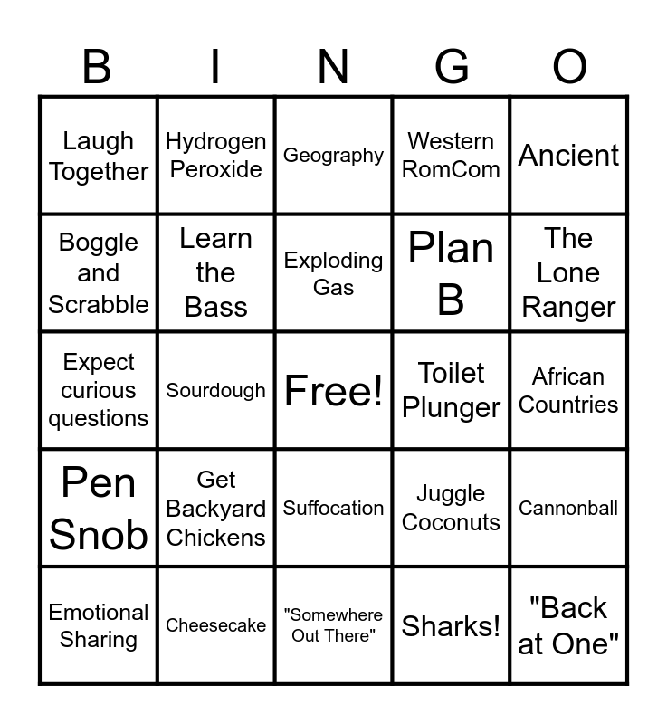 This bingo card has a free space and 27 words: Juggle Coconuts, 4 Minutes, Plan B, "Somewhere Out There", Boggle and Scrabble, Geography, Hydrogen Peroxide, Pen Snob, Toilet Plunger, Cannonball, Expect curious questions, Western RomCom, Emotional Sharing, Cheesecake, The Lone Ranger, "All Night Long", Learn the Bass, Exploding Gas, Get Backyard Chickens, Laugh Together, African Countries, Sharks!, Sourdough, "Back at One", Suffocation, Ancient and Martha Washington.