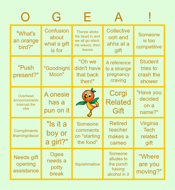 This bingo card has a free space and 34 words: "When is she due?", Someone alludes to the punch having alcohol in it, A reference about the baby being good at math, "Are you/Joesph excited?", Compliments theming/decor, "Goodnight Moon", Someone is too competitive, Needs gift opening assistance, Confusion about what a gift is for, White comes in, gives some high fives/pats on the back, then leaves, "Oh we didn't have that back then!", Thorpe sticks his head in and we all go silent, He waves, then leaves, Dr. Seuss book, Math related gift, Corgi Related Gift, Student tries to crash the shower, Ogea needs a potty break, Overhead announcements interrupt the vibe, "Is it a boy or a girl?", Retired teacher makes a cameo, Someone comments on "starting the food", The cuties cause confusion, "What's an orange bird?", "Have you decided on a name?", Squishmallow, "Where are you moving?", Collective ooh and ahhs at a gift, Someone gives unsolicited advice, A reference to a strange pregnancy craving, "Push present?", A gift is missing a name so someone yells "THAT ONE IS MINE!", A onesie has a pun on it, Virginia Tech related gift and Handmade gift.