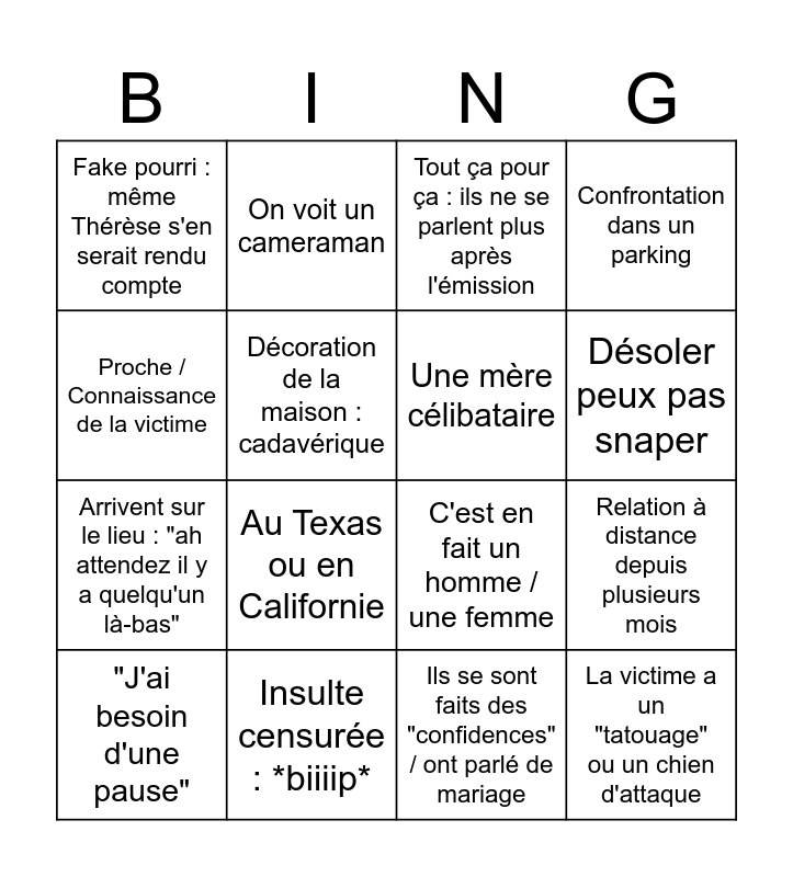 This bingo card has 20 words: Relation à distance depuis plusieurs mois, "J'ai menti, mais pas sur mes sentiments", Tout ça pour ça : ils ne se parlent plus après l'émission, Ils trouvent le man grâce à son n° de téléphone, "J'ai besoin d'une pause", Proche / Connaissance de la victime, Insulte censurée : *biiiip*, Fake pourri : même Thérèse s'en serait rendu compte, Arrivent sur le lieu : "ah attendez il y a quelqu'un là-bas", On voit un cameraman, Au Texas ou en Californie, C'est en fait un homme / une femme, Décoration de la maison : cadavérique, La victime a un "tatouage" ou un chien d'attaque, Une mère célibataire, La victime a prêté de l'argent : teubée, Désoler peux pas snaper, Confrontation dans un parking, Ils se sont faits des "confidences" / ont parlé de mariage and "Retrouvez-moi ailleurs".