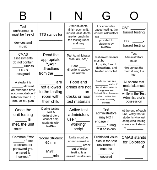 This bingo card has 35 words: If the unit testing time & directions are the ______, different grades can be administered in the _____ room, ELA: _____ min Science: 80 min, When distributing testing tickets, ensure each student is provided the testing ticket on which _____ name appears, Read the appropriate “SAY” directions from the ____, Active test administers use "______ working" script, For computer-based testing, the correct calculators are ___________ provided to students by TestNav., CMAS assessments do not contain ______ unless TTS is assigned, Unit 1 for Math Grades 6, 7, & 8 contains 2 sections: Unit 1 Section 1 = ___________ Unit 1 Section 2 = __________, Test Administrator Manual (TAM): Read ____ directions exactly as written, Secure test materials must not be _______ from the school's campus, A student is ______ allowed an extended time accommodation if listed in their IEP, 504, or ML plan, CBT: _______-based testing PBT: _____-based testing, Active test administers use _______ to keep students on task, Ensure students do not participate in any _______ activities, Test environments must be free of _________ devices and music, Units only go into _________ status if the student selects the green Yes, Submit Final Answers button on the Test Submit Warning screen., Prohibited visual aids in the test environment must be _______ or covered, _______ are not allowed in the testing room with their child, Once the unit testing _____ is met, the unit must ____, Food and drinks are not _______ on desks or near test materials, Test administrators may NOT engage in ____ _____ during test sessions, Common Error ______: “The username or password you entered is incorrect.”, At the end of each unit, verify that all students who just completed testing show a unit status of __________., Social Studies: 65 min Math: _____min, After students finish each unit, individual students are to remain in the testing room and may ________, Test Administrators must: _______ throughout the room during the test, CMAS stands for Colorado _______ of _________ ________, Used scratch paper is a ________ material, Test environments must be ________ lit, quite, free of distractions, and heated or cooled, All secure test materials must be ________ while in the Test Administrator’s possession, Immediately report all instances of testing irregularities and security breaches to ___ ___, Units must be administered in _________ order - out of order testing is a misadministration, During testing, Test Administrators cannot help students with TestNav __________, TTS stands for ____________ and Follow ______________ requirements to return all test materials after testing.