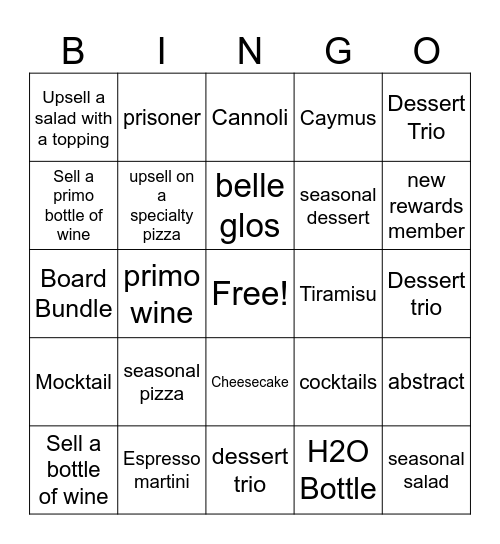This bingo card has a free space and 29 words: Sell a bottle of wine, specialty cocktail, primo wine, seasonal drink, Upsell a salad with a topping, Cannoli, upsell on a specialty pizza, seasonal pizza, Tiramisu, Espresso martini, Dessert trio, seasonal salad, dessert trio, H2O Bottle, new rewards member, flavored lemonade/tea, Cheesecake, Mocktail, Dessert Trio, Board Bundle, cocktails, Italian Soda, seasonal dessert, Sell a primo bottle of wine, Caymus, prisoner, abstract, belle glos and prisoner.