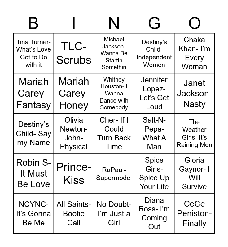 This bingo card has 42 words: Madonna- Like a Virgin, Whitney Houston- I Wanna Dance with Somebody, Cyndi Lauper- Girls Just Want to Have Fun, Prince- Kiss, Diana Ross- I’m Coming Out, Gloria Gaynor- I Will Survive, Cher- If I Could Turn Back Time, Eurythmics- Sweet Dreams, Michael Jackson- Wanna Be Startin Somethin, RuPaul- Supermodel, The Weather Girls- It’s Raining Men, Janet Jackson- Nasty, Olivia Newton-John- Physical, Chaka Khan- I’m Every Woman, Salt-N-Pepa- Push It, Spice Girls- Spice Up Your Life, Christina Aguilera- Genie in a Bottle, Destiny’s Child- Say my Name, Jennifer Lopez- Waiting for Loud, TLC- Scrubs, Mariah Carey– Fantasy, Britney Spears- Crazy, CeCe Peniston- Finally, Tina Turner- What’s Love Got to Do with it, TLC- Unpretty, Christina Aguilera- Come on Over Baby, Jennifer Lopez- Let’s Get Loud, Price- Kiss, Backstreet Boys- Everybody, Brandy- Statin Up in My Room, Shania Twain- You’re Still the One, Robin S- It Must Be Love, Mariah Carey- Honey, No Doubt- I’m Just a Girl, 69Boyz- Tootsee Roll, NCYNC- It’s Gonna Be Me, All Saints- Bootie Call, Salt-N-Pepa- What A Man, Ginuwine- PonyJennifer Lopez & JaRule- Ain’t it Funny, Aaliyah- Are You That Somebody?, Destiny's Child- Independent Women and Sir Mix-A-Lot- Baby Got Back.