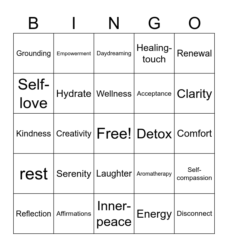 This bingo card has a free space and 24 words: Serenity, Affirmations, Wellness, Reflection, Renewal, Grounding, Self-love, Empowerment, Detox, Laughter, Acceptance, Kindness, Aromatherapy, Self-compassion, Hydrate, Energy, Comfort, Daydreaming, Clarity, Creativity, Disconnect, rest, Healing-touch and Inner-peace.
