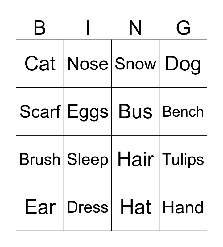 This bingo card has 16 words: Dress, Tulips, Snow, Cat, Brush, Nose, Hair, Hat, Scarf, Eggs, Ear, Dog, Sleep, Bench, Bus and Hand.