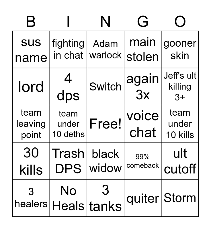 This bingo card has a free space and 24 words: Trash DPS, No Heals, Switch, 3 healers, gooner skin, sus name, lord, fighting in chat, voice chat, black widow, again 3x, team leaving point, 99% comeback, ult cutoff, 4 dps, quiter, team under 10 kills, Adam warlock, Jeff's ult killing 3+, team under 10 deths, Storm, 30 kills, main stolen and 3 tanks.