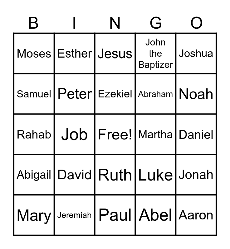 This bingo card has a free space and 24 words: David, Jeremiah, Ezekiel, Mary, Joshua, Moses, Samuel, Esther, Martha, Ruth, Abraham, Rahab, Luke, Jonah, Peter, Abel, Daniel, Jesus, Noah, Job, Aaron, Abigail, John the Baptizer and Paul.