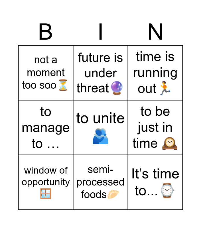 This bingo card has a free space and 8 words: to be just in time 🕰, time is running out🏃, future is under threat🔮, window of opportunity🪟, not a moment too soo⏳, It’s time to...⌚, to manage to … and semi-processed foods🥟.