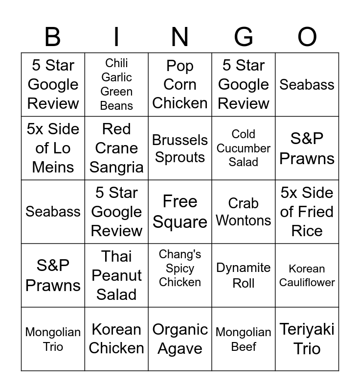 This bingo card has a free space and 24 words: Mongolian Trio, Thai Peanut Salad, Brussels Sprouts, Mongolian Beef, Seabass, 5 Star Google Review, Chili Garlic Green Beans, Pop Corn Chicken, Crab Wontons, 5x Side of Fried Rice, Seabass, Red Crane Sangria, Dynamite Roll, Korean Cauliflower, 5x Side of Lo Meins, Korean Chicken, Organic Agave, 5 Star Google Review, S&P Prawns, S&P Prawns, 5 Star Google Review, Chang's Spicy Chicken, Cold Cucumber Salad and Teriyaki Trio.