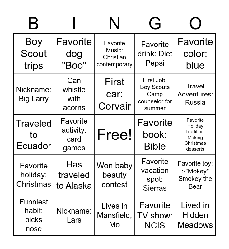 This bingo card has a free space and 35 words: Loves to eat ribs, Lived in Valley Center, Career: Plumbing contractor, Can whistle with acorns, Won baby beauty contest, Favorite drink: Diet Pepsi, Nickname: Big Larry, Married Lorrie, First car: Corvair, Favorite hobby: building, Traveled to Ecuador, Favorite color: blue, Favorite dessert: ice cream, Favorite music: John Denver, Boy Scout trips, Favorite book: Bible, Favorite TV show: NCIS, Favorite activity: card games, Favorite holiday: Christmas, Lived in Hidden Meadows, Favorite vacation spot: Sierras, Funniest habit: picks nose, Favorite toy: :-"Mokey" Smokey the Bear, Nickname: Lars, Favorite Music: Christian contemporary, Travel Adventures: Russia, Favorite camping Spot:Sierra Mountains, Delivered Scott at Home, First Job: Boy Scouts Camp counselor for summer, Favorite Holiday Tradition: Making Christmas desserts, Lived in Hawthorn L.A, Lives in Mansfield, Mo, Has traveled to Alaska, Favorite dog "Boo" and Favorite activity working.