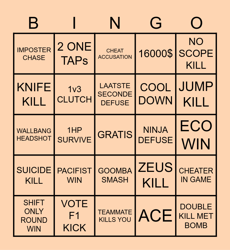 This bingo card has a free space and 24 words: PACIFIST WIN, VOTE F1 KICK, LAATSTE SECONDE DEFUSE, SHIFT ONLY ROUND WIN, NO SCOPE KILL, IMPOSTER CHASE, KNIFE KILL, 2 ONE TAPs, NINJA DEFUSE, GOOMBA SMASH, COOL DOWN, WALLBANG HEADSHOT, ZEUS KILL, CHEATER IN GAME, 1v3 CLUTCH, ACE, ECO WIN, CHEAT ACCUSATION, JUMP KILL, 1HP SURVIVE, DOUBLE KILL MET BOMB, SUICIDE KILL, 16000$ and TEAMMATE KILLS YOU.