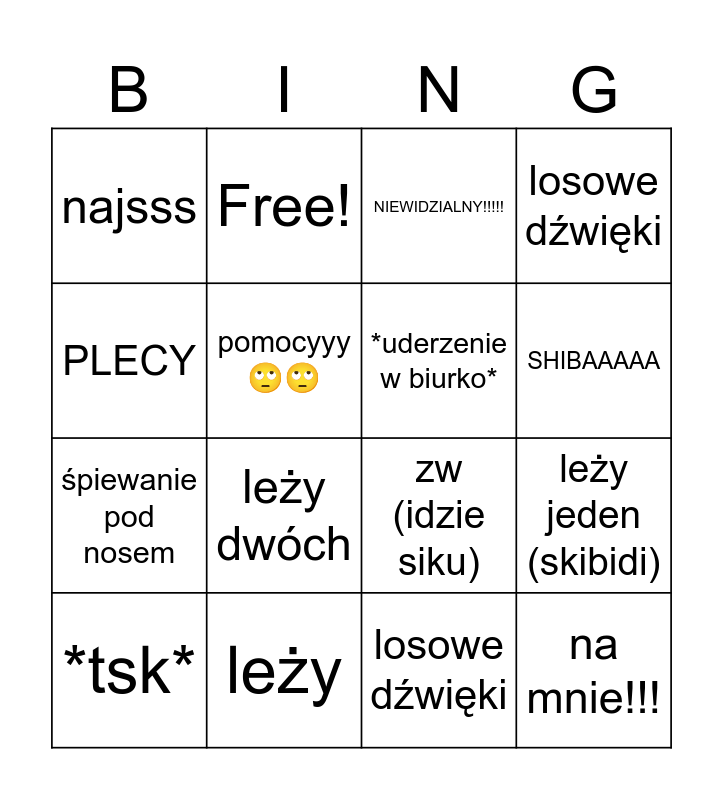 This bingo card has 19 words: zw (idzie siku), ONI TU IDOM, NIEWIDZIALNY!!!!!, na mnie!!!, leży jeden (skibidi), PLECY, losowe dźwięki, najsss, Free!, śpiewanie pod nosem, leży dwóch, pomocyyy 🙄🙄, *uderzenie w biurko*, leży, *tsk*, zw (idzie siku i się przytulić), losowe dźwięki, SHIBAAAAA and zw (idzie siku).