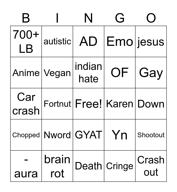 This bingo card has a free space and 24 words: Nword, brain rot, indian hate, -aura, jesus, 700+ LB, Anime, autistic, Karen, GYAT, OF, Car crash, Yn, Shootout, Vegan, Cringe, Down, AD, Gay, Fortnut, Crash out, Chopped, Emo and Death.