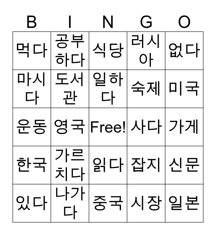 This bingo card has a free space and 24 words: 가르치다, 나가다, 일하다, 있다, 없다, 먹다, 마시다, 공부하다, 사다, 읽다, 숙제, 운동, 잡지, 신문, 도서관, 시장, 가게, 식당, 미국, 영국, 일본, 한국, 러시아 and 중국.