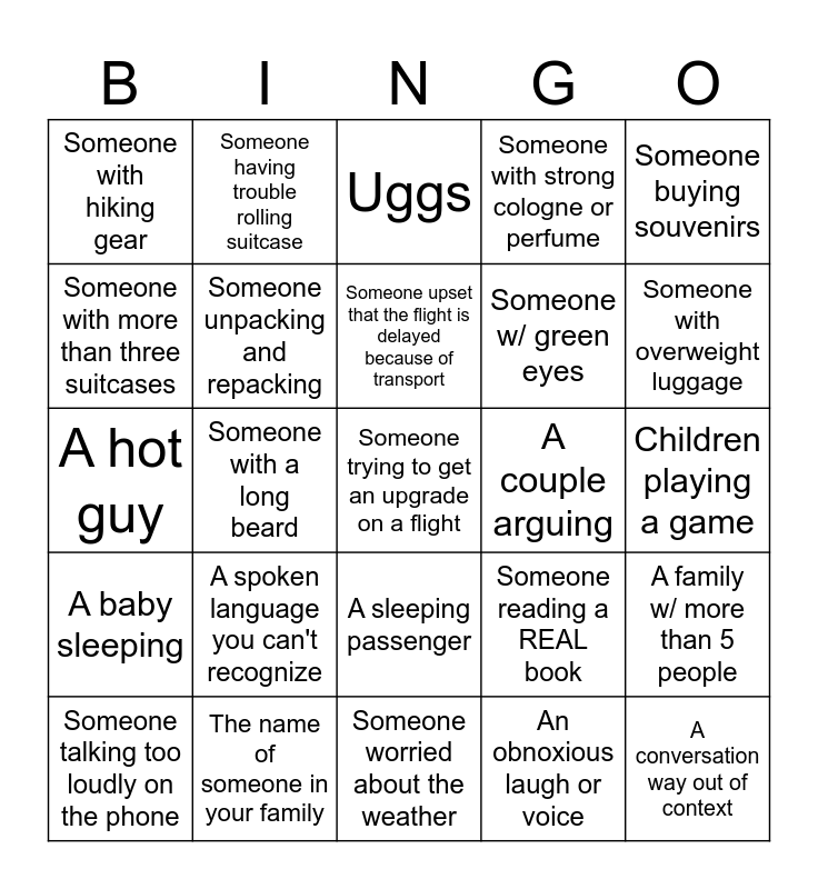 This bingo card has 25 words: A spoken language you can't recognize, Someone worried about the weather, Someone upset that the flight is delayed because of transport, Someone talking too loudly on the phone, Someone buying souvenirs, Someone with hiking gear, Someone with more than three suitcases, Someone having trouble rolling suitcase, A couple arguing, A sleeping passenger, Someone w/ green eyes, A hot guy, Someone reading a REAL book, A family w/ more than 5 people, Someone unpacking and repacking, A conversation way out of context, Children playing a game, Uggs, Someone with overweight luggage, Someone with a long beard, Someone trying to get an upgrade on a flight, The name of someone in your family, A baby sleeping, Someone with strong cologne or perfume and An obnoxious laugh or voice.