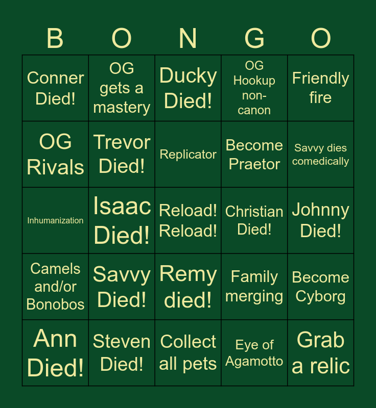 This bingo card has a free space and 29 words: Ann Died!, Adrian Died!, Isaac Died!, Goku Died!, Conner Died!, Ducky Died!, Trevor Died!, Savvy Died!, Christian Died!, Steven Died!, Johnny Died!, Grab a relic, Collect all pets, Eye of Agamotto, Savvy dies comedically, Savvy's Pendulum, Remy died!, Camels and/or Bonobos, Friendly fire, Inhumanization, Family merging, Fill out first lvl Anomaly, Become Praetor, OG Rivals, OG Hookup non-canon, OG gets a mastery, Become Cyborg, Replicator and OG = Gods (if they wanna).