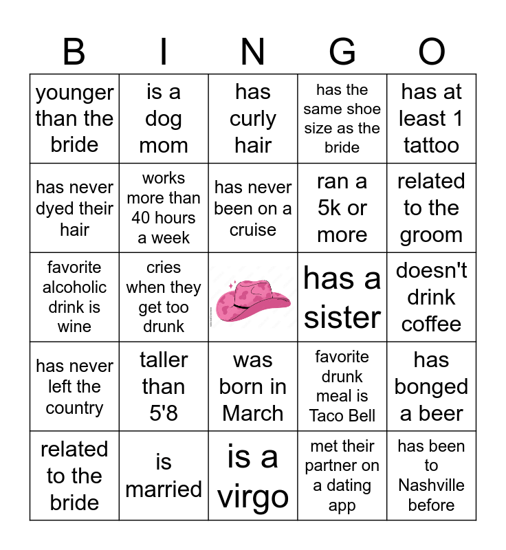 This bingo card has a free space and 43 words: went to school with the bride, has been to Nashville before, is a Gemini, related to the bride, is single, met their partner on a dating app, has curly hair, posted on social media today, has at least 1 tattoo, is married, has the same shoe size as the bride, has a sister, was born in March, taller than 5'8, known the bride for 10+ years, is a virgo, has not taken a shot yet today, favorite alcoholic drink is wine, been on vacation with the bride, related to the groom, is a dog mom, has blonde hair, took a nap today, younger than the bride, has more than 2 piercings, doesn't drink coffee, has a masters degree, wearing gold jewelry, favorite drunk meal is Taco Bell, has never left the country, has puked from being hungover, has bonged a beer, has shoulder length hair, cries when they get too drunk, has been with their partner for 5+ years, has cut their own hair, doesn't like champagne, has never been on a cruise, has never dyed their hair, ran a 5k or more, doesn't like country music, works more than 40 hours a week and has blue eyes.