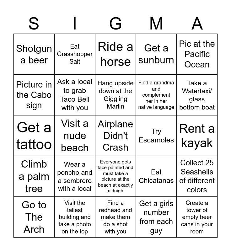 This bingo card has a free space and 24 words: Wear a poncho and a sombrero with a local, Visit the tallest building and take a photo on the top, Hang upside down at the Giggling Marlin, Go to The Arch, Pic at the Pacific Ocean, Shotgun a beer, Picture in the Cabo sign, Eat Grasshopper Salt, Try Escamoles, Everyone gets face painted and must take a picture at the beach at exactly midnight, Find a grandma and complement her in her native language, Get a tattoo, Eat Chicatanas, Collect 25 Seashells of different colors, Ask a local to grab Taco Bell with you, Get a girls number from each guy, Rent a kayak, Ride a horse, Take a Watertaxi/ glass bottom boat, Visit a nude beach, Create a tower of empty beer cans in your room, Climb a palm tree, Get a sunburn and Find a redhead and make them do a shot with you.
