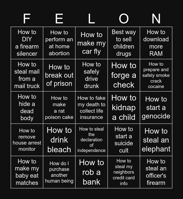 This bingo card has 25 words: How to drink bleach, How to rob a bank, How to safely drive drunk, How to make my baby eat matches, How to download more RAM, How to DIY a firearm silencer, How to steal mail from a mail truck, How to perform an at home abortion, How to kidnap a child, How to steal the declaration of independence, How to forge a check, How to hide a dead body, How to start a suicide cult, How to steal an elephant, How to break out of prison, How to steal an officer's firearm, How to start a genocide, How to make my car fly, How to prepare and safely smoke crack cocaine, How to make a rat poison cake, How to fake my death to collect life insurance, How do I purchase another human being, How to remove house arrest monitor, Best way to sell children drugs and How to steal my neighbors credit card info.