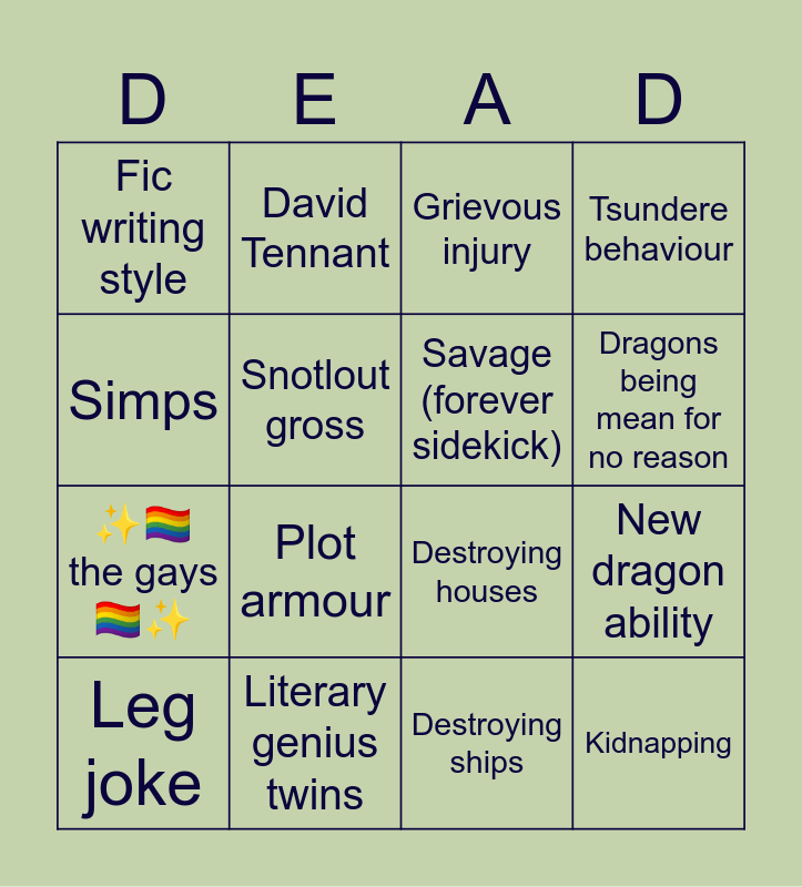 This bingo card has 26 words: Old couple bickering, Loki'd, Dragons being mean for no reason, Wild dragons ❤ hiccup, Simps, Fic writing style, Snotlout gross, David Tennant, Destroying ships, Misunderstanding, ✨🏳🌈the gays🏳🌈✨, Destroying houses, Reused asset, Stoic the vast, New dragon ability, Nerds, Tsundere behaviour, Kidnapping, Grievous injury, Leg joke, Plot armour, Why? because plot, Literary genius twins, Cat, Savage (forever sidekick) and Gobber lore drop.