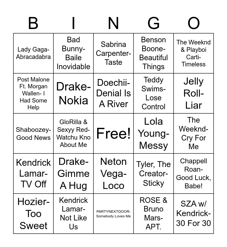 This bingo card has a free space and 61 words: Kendrick Lamar & SZA- Luther, Kendrick Lamar- Not Like Us, Shaboozey- A Bar Song, Kendrick Lamar- TV Off, ROSE & Bruno Mars- APT., Chappell Roan- Pink Pony Club, Drake- Nokia, Billie Elish- Birds of a Feather, Teddy Swims- Lose Control, Gracie Abrams- That’s So True, Benson Boone- Beautiful Things, Doechii- Anxiety, Post Malone Ft. Morgan Wallen- I Had Some Help, Kendrick Lamar- Squabble Up, Sabrina Carpenter- Espresso, Lady Gaga- Abracadabra, SZA w/ Kendrick- 30 For 30, The Weeknd & Playboi Carti- Timeless, Tate McRae- Sports Car, Doechii- Denial Is A River, Lola Young- Messy, Sabrina Carpenter- Taste, Hozier- Too Sweet, Chappell Roan- Good Luck, Babe!, Myles Smith- Stargazing, Jimin- Who, Sabrina Carpenter- Bed Chem, Tate McRae- Revolving Door, Jelly Roll- Liar, Kendrick Lamar & SZA- All The Stars, Bad Bunny- DTMF, SZA- BMF, PARTYNEXTDOOR- Die Trying, The Marias- No One Noticed, Bad Bunny-Baile Inovidable, Teddy Swims- Bad Dreams, Billie Eilish- Wildflower, GloRilla & Sexyy Red- Watchu Kno About Me, Sabrina Carpenter- Please Please Please, Shaboozey- Good News, Lady Gaga- Garden Of Eden, Drake- Gimme A Hug, The Weeknd- Cry For Me, Benson Boone- Sorry I’m Here For Someone Else, Tyler, The Creator- Sticky, Leon Thomas-Mutt, Lady Gaga- Vanish Into Me, Gelo- Tweaker, Fuerza Regida- Me Jalo, Neton Vega- Loco, PARTYNEXTDOOR- Somebody Loves Me, j-Hope ft. Miguel- Sweet Dreams, Sabrina Carpenter-Busy Woman, Bhad Bhabie- Ms. Whitman, Lady GaGa- How Bad Do U Want Me, Summer Walker- Heart Of A Woman, Sexyy Red & Bruno Mars- Fat Juicy & Wet, JENNIE & Dua Lipa- Handlebars, Ella Mai- Little Things, Like JENNIE- JENNIE and Tyla- Push 2 Start.