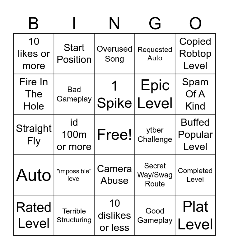 This bingo card has a free space and 29 words: Rated Level, id 10m or less, id 100m or more, Good Color Trigger Use, 10 likes or more, Overused Song, Bad Gameplay, "impossible" level, ytber Challenge, Terrible Structuring, Buffed Popular Level, Plat Level, 10 dislikes or less, Good Gameplay, Spam Of A Kind, Featured Level, Camera Abuse, Auto, Copied Robtop Level, Straight Fly, Secret Way/Swag Route, Actual Deco, Epic Level, Fire In The Hole, Requested Auto, Start Position, Completed Level, 1 Spike and Main Songs 17-22.