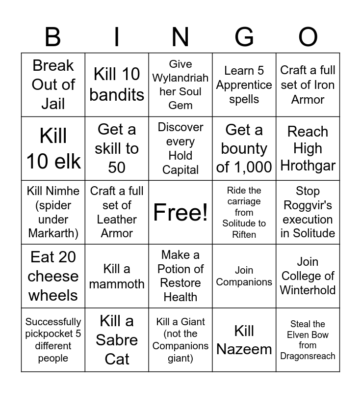 This bingo card has a free space and 49 words: Get 5,000 Septims, Steal the Elven Bow from Dragonsreach, Learn 1 Word of Power, Kill a Giant (not the Companions giant), Kill a mammoth, Clear a Nordic Ruin, Kill 10 bandits, Kill 5 rabbits, Kill 10 elk, Read a Skill Book, Get a skill to 50, Learn 5 Apprentice spells, Join College of Winterhold, Join Companions, Join Thieves' Guild, Find 3 Stones of Barenziah, Discover every Hold Capital, Ride the carriage from Solitude to Riften, Reach level 10, Craft a full set of Iron Armor, Craft a full set of Leather Armor, Kill Nazeem, Break Out of Jail, Get a bounty of 1,000, Suplex Grelod the Kind, Reach High Hrothgar, Successfully pickpocket 5 different people, Discover Raven Rock, Make a Potion of Restore Health, Eat 20 cheese wheels, Find Meridia's Beacon, Steal a book from the Arcaneum, Craft 1 of each weapon type, Kill a troll, Kill a Sabre Cat, Collect sap from the Sleeping Tree, Drink Skooma, Find 10 Nirnroot, Stop Roggvir's execution in Solitude, Buy a horse, Give a beggar a septim, Exhaust all of Jon Battle-Born's dialogue, Enchant 5 items, Find Amren's Sword, Kill Nimhe (spider under Markarth), Give Wylandriah her Soul Gem, Steal Nelecar's Staff, Return the Golden Claw to Lucan Valerius and Disenchant 5 items.