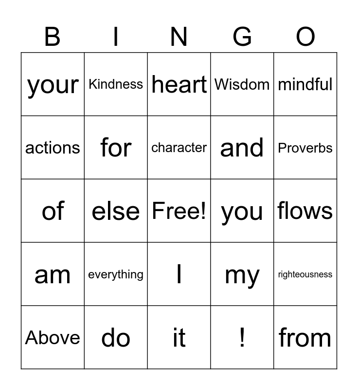 This bingo card has a free space and 29 words: Above, all, else, guard, your, heart, for, everything, you, do, flows, from, it, !, Proverbs, 4:23, I, am, mindful, of, my, thoughts, and, actions, Wisdom, Kindness, righteousness, character and focus.