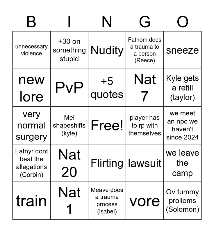 This bingo card has a free space and 24 words: Nat 20, Nat 1, +5 quotes, train, sneeze, unnecessary violence, new lore, +30 on something stupid, player has to rp with themselves, Flirting, Nat 7, very normal surgery, lawsuit, we leave the camp, PvP, vore, we meet an npc we haven't since 2024, Nudity, Kyle gets a refill (taylor), Mel shapeshifts (kyle), Ov tummy prollems (Solomon), Fafnyr dont beat the allegations (Corbin), Fathom does a trauma to a person (Reece) and Meave does a trauma process (isabel).