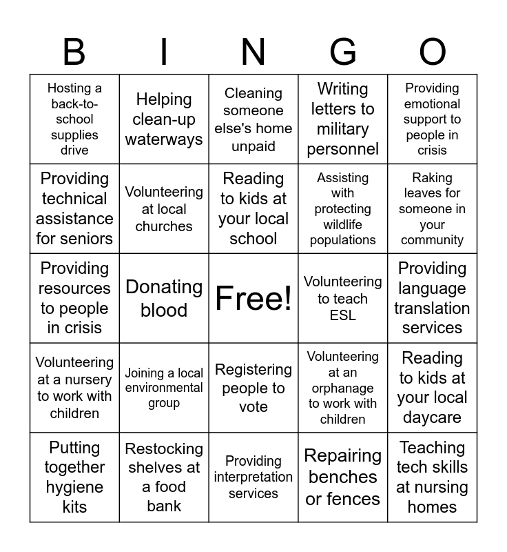 This bingo card has a free space and 30 words: Restocking shelves at a food bank, Mentoring students, Donating blood, Hosting a holiday donation drive, Hosting a back-to-school supplies drive, Cleaning someone else's home unpaid, Volunteering at local churches, Registering people to vote, Volunteering to teach ESL, Providing interpretation services, Providing language translation services, Teaching tech skills at nursing homes, Repairing benches or fences, Volunteering to paint in your community, Raking leaves for someone in your community, Mowing lawns for someone in your community, Volunteering at an orphanage to work with children, Volunteering at a nursery to work with children, Joining a local environmental group, Providing emotional support to people in crisis, Providing resources to people in crisis, Volunteering to lead a children's sports team, Helping clean-up waterways, Assisting with protecting wildlife populations, Providing technical assistance for seniors, Writing letters to military personnel, Reading to kids at your local daycare, Putting together hygiene kits, Reading to kids at your local school and Volunteering at your local library.