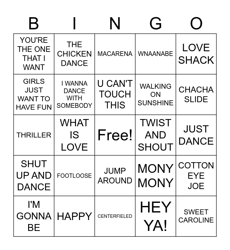 This bingo card has a free space and 59 words: UPTOWN FUNK, HAPPY, STAYIN ALIVE, SHUT UP AND DANCE, HEY YA!, DANCING QUEEN, I WANNA DANCE WITH SOMEBODY, CUPID SHUFFLE, WALKING ON SUNSHINE, WAKE ME UP BEFORE YOU GO-GO, WNAANABE, CELEBRATION, GIRLS JUST WANT TO HAVE FUN, Y.M.C.A, MAMBO NO. 5, YOU'RE THE ONE THAT I WANT, SWEET CAROLINE, LOVE SHACK, UPTOWN GIRL, U CAN'T TOUCH THIS, TWIST AND SHOUT, MACARENA, I'M GONNA BE, COTTON EYE JOE, GANGNAM STYLE, CRANK THAT, THE LOCOMOTION, CONGA, CHACHA SLIDE, NEVER GONNA GIVE IT UP, THE TWIST, WATCH ME, PLAY THAT FUNKY MUSIC, SHOUT, THE CHICKEN DANCE, KUNG FU FIGHTING, FIHING IN THE DARK, WHAT IS LOVE, SINGLE LADIES, THRILLER, ELECTRIC BOOGIE, FOOTLOOSE, JUST DANCE, APACHE, YEAH, BILLIE JEAN, FAME, ROCK AND ROLL, JUMP AROUND, CENTERFIELED, PUMP UP THE JAM, BANG THE DRUM ALL DAY, WE LIKE TO PARTY, HIPS DONT LIE, BOOT SCOOTIN BOOGIE, MONY MONY, WATERMELON CRAWL, BRICK HOUSE and CAN'T STOP THE FEELING.
