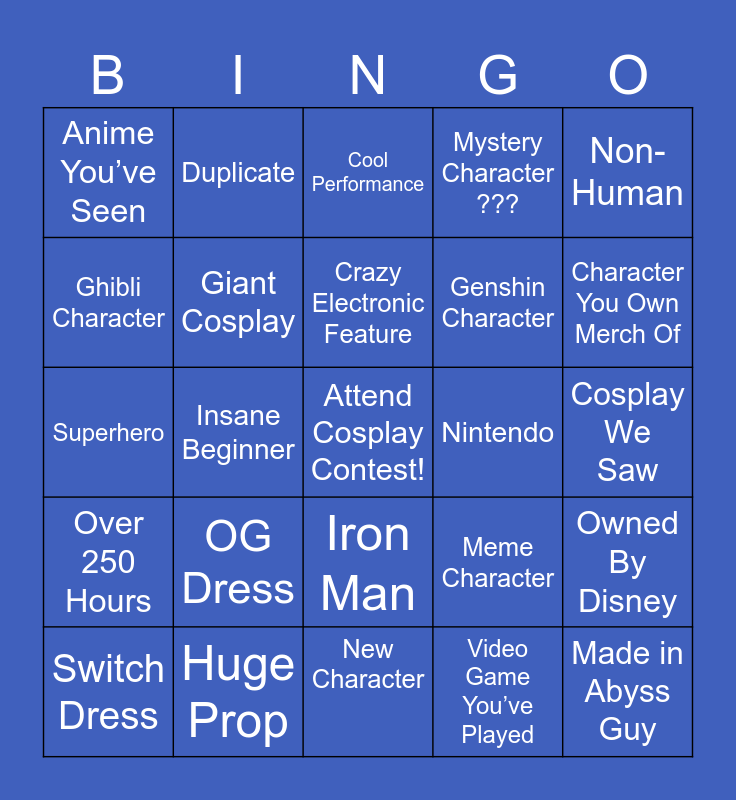 This bingo card has a free space and 29 words: Switch Dress, Villain, Insane Beginner, Duo, Anime You’ve Seen, Cool Performance, Giant Cosplay, OG Dress, Nintendo, Huge Prop, Cosplay We Saw, Made in Abyss Guy, New Character, Video Game You’ve Played, Character You Own Merch Of, Gender Swap / Femboy, Iron Man, Over 250 Hours, Non-Human, Superhero, Meme Character, Fail, Genshin Character, Ghibli Character, Mystery Character ???, Duplicate, Owned By Disney, Crazy Electronic Feature and Over 500 Hours.