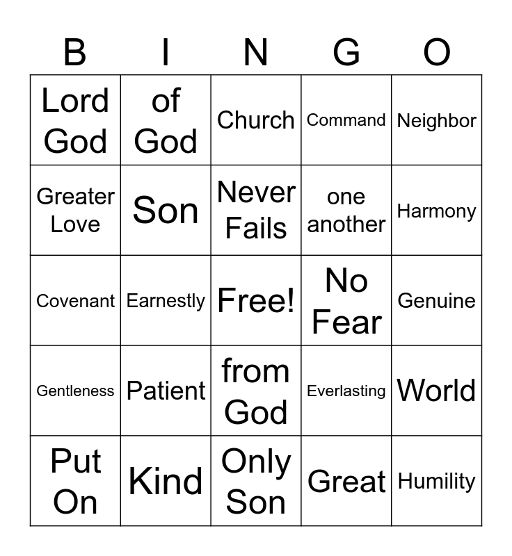 This bingo card has a free space and 24 words: Patient, Kind, Never Fails, Put On, Neighbor, Lord God, Greater Love, of God, No Fear, from God, one another, Covenant, Everlasting, World, Son, Great, Genuine, Church, Harmony, Earnestly, Humility, Gentleness, Command and Only Son.