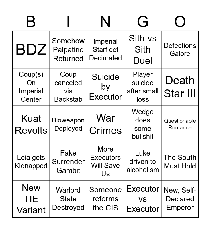This bingo card has a free space and 24 words: Fake Surrender Gambit, Warlord State Destroyed, Suicide by Executor, New TIE Variant, Defections Galore, BDZ, Coup(s) On Imperial Center, Somehow Palpatine Returned, Wedge does some bullshit, More Executors Will Save Us, Player suicide after small loss, Kuat Revolts, Luke driven to alcoholism, The South Must Hold, Coup canceled via Backstab, Executor vs Executor, Questionable Romance, Imperial Starfleet Decimated, Death Star III, Bioweapon Deployed, New, Self-Declared Emperor, Leia gets Kidnapped, Sith vs Sith Duel and Someone reforms the CIS.