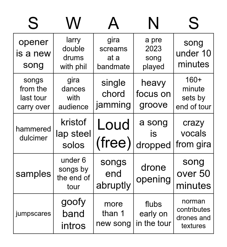 This bingo card has a free space and 24 words: under 6 songs by the end of tour, goofy band intros, single chord jamming, jumpscares, song under 10 minutes, opener is a new song, songs from the last tour carry over, larry double drums with phil, a song is dropped, songs end abruptly, heavy focus on groove, hammered dulcimer, drone opening, song over 50 minutes, gira dances with audience, flubs early on in the tour, crazy vocals from gira, gira screams at a bandmate, 160+ minute sets by end of tour, kristof lap steel solos, norman contributes drones and textures, samples, a pre 2023 song played and more than 1 new song.