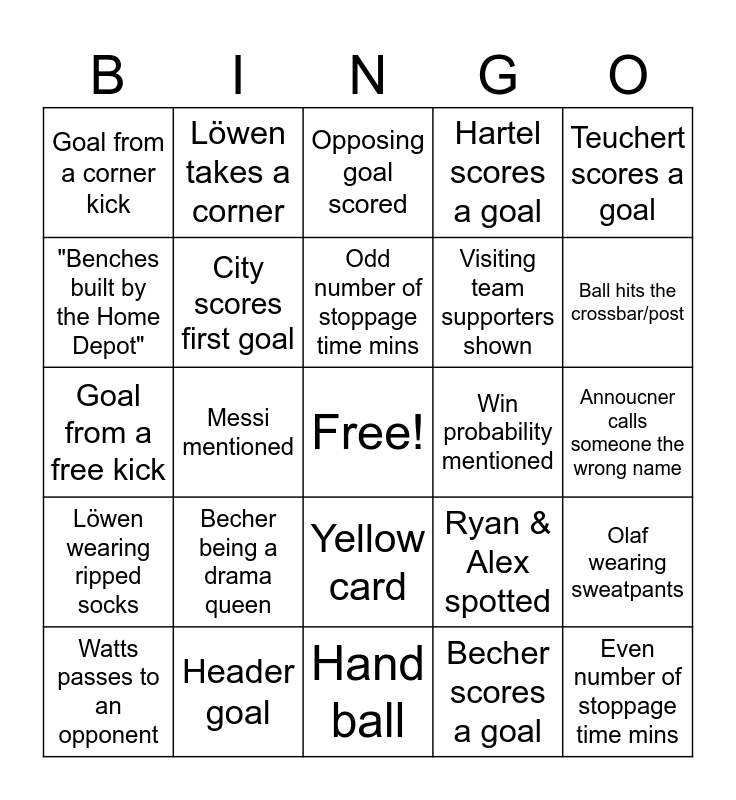 This bingo card has a free space and 24 words: Becher being a drama queen, Header goal, Odd number of stoppage time mins, Watts passes to an opponent, Teuchert scores a goal, Goal from a corner kick, "Benches built by the Home Depot", Löwen takes a corner, Win probability mentioned, Yellow card, Visiting team supporters shown, Goal from a free kick, Ryan & Alex spotted, Olaf wearing sweatpants, City scores first goal, Becher scores a goal, Annoucner calls someone the wrong name, Opposing goal scored, Ball hits the crossbar/post, Messi mentioned, Even number of stoppage time mins, Löwen wearing ripped socks, Hartel scores a goal and Hand ball.