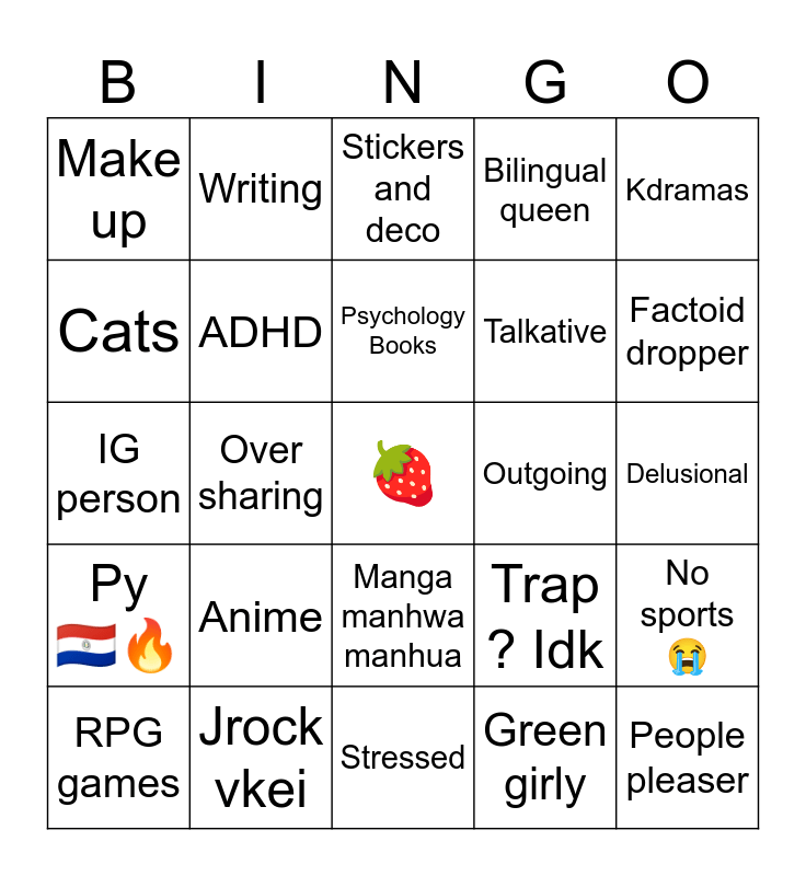 This bingo card has a free space and 24 words: Anime, Jrock vkei, Psychology Books, RPG games, Kdramas, Make up, Cats, Writing, Outgoing, Manga manhwa manhua, Talkative, IG person, Trap ? Idk, No sports 😭, ADHD, Green girly, Delusional, Stickers and deco, Factoid dropper, Over sharing, People pleaser, Py 🇵🇾🔥, Bilingual queen and Stressed.