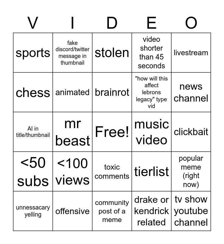 This bingo card has a free space and 29 words: unnessacary yelling, red arrow in the thumbnail, mr beast, $ in the title, sports, stolen, animated, <100 views, music video, offensive, clickbait, tv show youtube channel, community post of a meme, drake or kendrick related, news channel, compilation vid, toxic comments, <50 subs, livestream, AI in title/thumbnail, tierlist, video longer than 90 minutes, "how will this affect lebrons legacy" type vid, chess, video shorter than 45 seconds, fake discord/twitter message in thumbnail, popular meme (right now), brainrot and [video game], but.