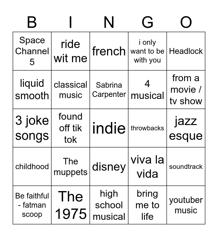 This bingo card has a free space and 24 words: The muppets, The 1975, Sabrina Carpenter, Be faithful - fatman scoop, Headlock, Space Channel 5, liquid smooth, ride wit me, throwbacks, disney, 4 musical, 3 joke songs, viva la vida, soundtrack, classical music, bring me to life, jazz esque, french, from a movie / tv show, found off tik tok, youtuber music, childhood, i only want to be with you and high school musical.
