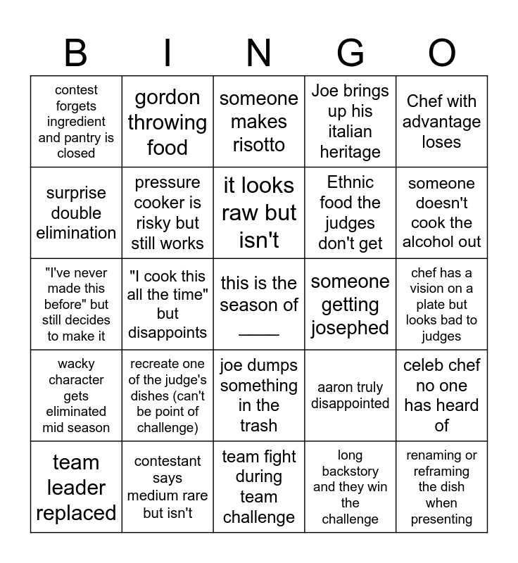 This bingo card has a free space and 24 words: recreate one of the judge's dishes (can't be point of challenge), contestant says medium rare but isn't, it looks raw but isn't, team leader replaced, Chef with advantage loses, contest forgets ingredient and pantry is closed, surprise double elimination, gordon throwing food, someone getting josephed, joe dumps something in the trash, Ethnic food the judges don't get, "I've never made this before" but still decides to make it, aaron truly disappointed, celeb chef no one has heard of, pressure cooker is risky but still works, long backstory and they win the challenge, chef has a vision on a plate but looks bad to judges, someone makes risotto, someone doesn't cook the alcohol out, "I cook this all the time" but disappoints, renaming or reframing the dish when presenting, wacky character gets eliminated mid season, Joe brings up his italian heritage and team fight during team challenge.