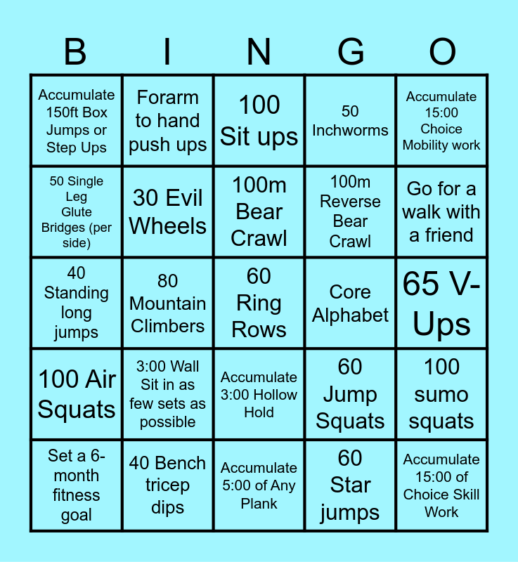 This bingo card has a free space and 39 words: 50 Pushups (bench, wall or floor), 40 Burpees, 100 Situps, 30 Evil Wheels, Set a 6-month fitness goal, Accumulate 3:00 Hollow Hold, 100m Bear Crawl, 50 Dips, Accumulate 15:00 Choice Mobility work, 100 Air Squats, 80 Mountain Climbers, 50 Inchworms, Accumulate 15:00 of Choice Skill Work, 65 V-Ups, Core Alphabet, 3:00 Wall Sit in as few sets as possible, 3:00 Sun Salutations, Accumulate 150ft Box Jumps or Step Ups, 40 Slow-mo Plank Shoulder Taps, 60 Jump Squats, 50 Single Leg Glute Bridges (per side), Accumulate 5:00 of Any Plank, 100m Reverse Bear Crawl, Go for a walk with a friend, 50 Pushups (bench, wall or floor), 40 Burpees, Full court bear crawl x2, 2 min Wall Sit, 100 Glute bridges, Forarm to hand push ups, 60 Single leg scoops, Full court sprint x2, 100 Sit ups, 40 Bench tricep dips, 60 Star jumps, 50 Inchworms, 100 sumo squats, 40 Standing long jumps and 2 min Plank hold.