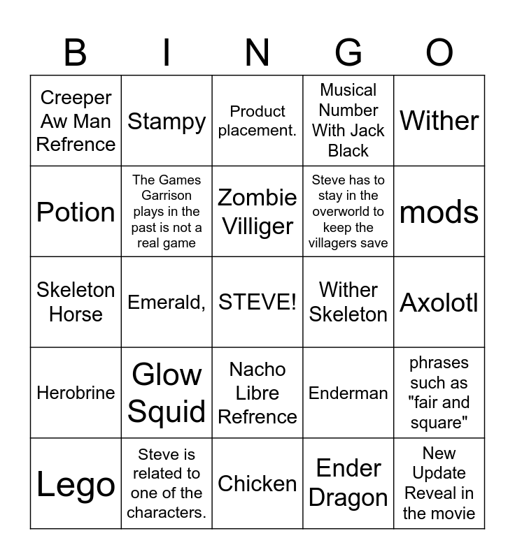 This bingo card has a free space and 59 words: Alex Mention, Steve is related to one of the characters., Youtuber Cameo, Herobrine, Ender Dragon, Notch/Jeb cameo, The Games Garrison plays in the past is not a real game, Reference to the trailer reaction, Steve has to stay in the overworld to keep the villagers save, Someone says something along the lines, "What is this place?'', Musical Number With Jack Black, Fart Joke, Potion, Speedrunning Refrence, Sequel Bait/After Credits Scene, Creeper Aw Man Refrence, New Update Reveal in the movie, Wither, Pig, Zombie Villiger, Wither Skeleton, Product placement., Lego, phrases such as "fair and square", Minecraft Fan Song, Free Space 2, mojang, microsoft, mods, minecon, minecraft storymode, herobrine, The Rock Appears For no Reason, Dr.Trayaurus, Stampy, Good Piglin, Horse, Emerald,, Someone Respawns, Skeleton Horse, Creaking, Glow Squid, Axolotl, Baby Villiger, Chicken Jockey, Pink Sheep, Digging Straight Down, Cobble Stone Generater, Nacho Libre Refrence, Chicken, Mooshroom, Skeleton, Pumpkin, Wolf, Redstone, Enderman, Forced Bittersweet Moment, Bow And Arrow and Diamond.