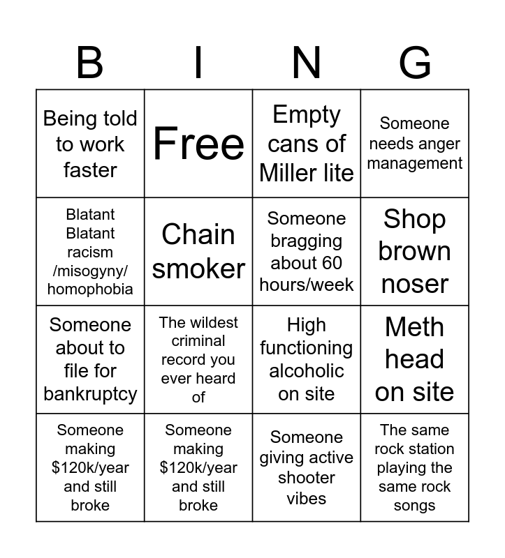 This bingo card has 16 words: Someone making $120k/year and still broke, Meth head on site, Empty cans of Miller lite, Being told to work faster, Someone about to file for bankruptcy, Free, High functioning alcoholic on site, Someone giving active shooter vibes, Blatant Blatant racism /misogyny/ homophobia, Chain smoker, Someone making $120k/year and still broke, Someone needs anger management, The wildest criminal record you ever heard of, Shop brown noser, Someone bragging about 60 hours/week and The same rock station playing the same rock songs.