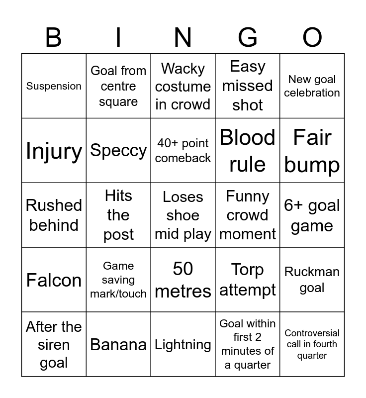 This bingo card has 35 words: Goal kicked outside 50, 4+ bounce run, Argy bargy, Speccy, 50 metres, Easy missed shot, Injury, Smother, 40+ point comeback, GOTY contender, Rushed behind, New goal celebration, Score review, Debut goal, Suspension, Funny crowd moment, Goal within first 2 minutes of a quarter, Hits the post, Falcon, Loses shoe mid play, Torp attempt, After the siren goal, Ruckman goal, Banana, Wacky costume in crowd, Fair bump, Controversial call in fourth quarter, Mid-bite of pie on broadcast, Blood rule, 6+ goal game, Concussion, Lightning, Game saving mark/touch, Goal from centre square and Player subbed out in 1st quarter.