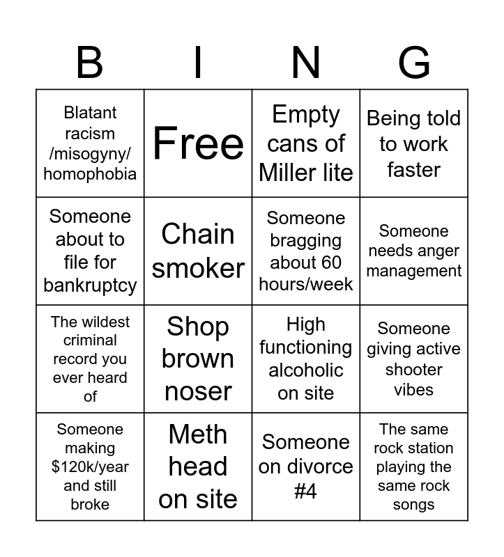 This bingo card has 16 words: Someone making $120k/year and still broke, Meth head on site, Empty cans of Miller lite, Being told to work faster, Someone about to file for bankruptcy, Free, High functioning alcoholic on site, Someone giving active shooter vibes, Blatant racism /misogyny/ homophobia, Chain smoker, Someone on divorce #4, Someone needs anger management, The wildest criminal record you ever heard of, Shop brown noser, Someone bragging about 60 hours/week and The same rock station playing the same rock songs.