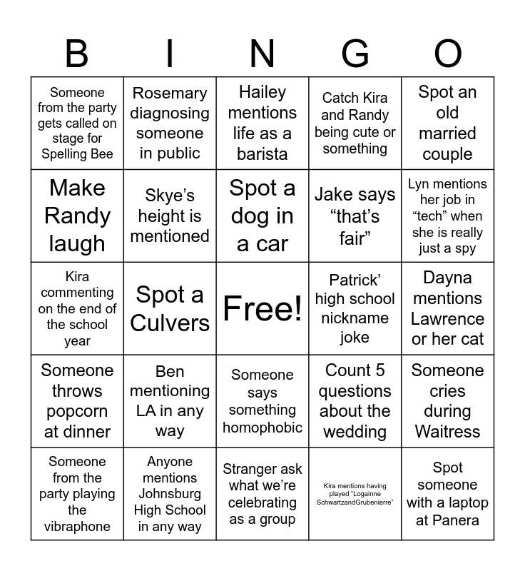 This bingo card has a free space and 24 words: Ben mentioning LA in any way, Anyone mentions Johnsburg High School in any way, Spot a dog in a car, Someone from the party playing the vibraphone, Spot an old married couple, Someone from the party gets called on stage for Spelling Bee, Make Randy laugh, Rosemary diagnosing someone in public, Patrick’ high school nickname joke, Someone says something homophobic, Jake says “that’s fair”, Kira commenting on the end of the school year, Count 5 questions about the wedding, Someone cries during Waitress, Skye’s height is mentioned, Kira mentions having played “Logainne SchwartzandGrubenierre”, Dayna mentions Lawrence or her cat, Hailey mentions life as a barista, Lyn mentions her job in “tech” when she is really just a spy, Spot a Culvers, Spot someone with a laptop at Panera, Someone throws popcorn at dinner, Catch Kira and Randy being cute or something and Stranger ask what we’re celebrating as a group.