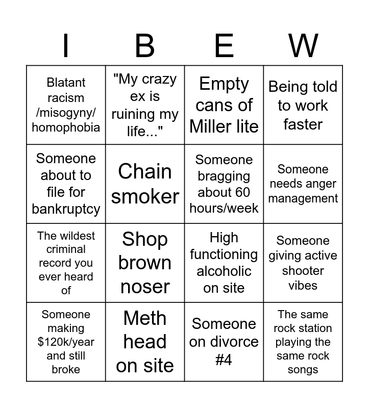 This bingo card has 16 words: Someone making $120k/year and still broke, Meth head on site, Empty cans of Miller lite, Being told to work faster, Someone about to file for bankruptcy, "My crazy ex is ruining my life...", High functioning alcoholic on site, Someone giving active shooter vibes, Blatant racism /misogyny/ homophobia, Chain smoker, Someone on divorce #4, Someone needs anger management, The wildest criminal record you ever heard of, Shop brown noser, Someone bragging about 60 hours/week and The same rock station playing the same rock songs.