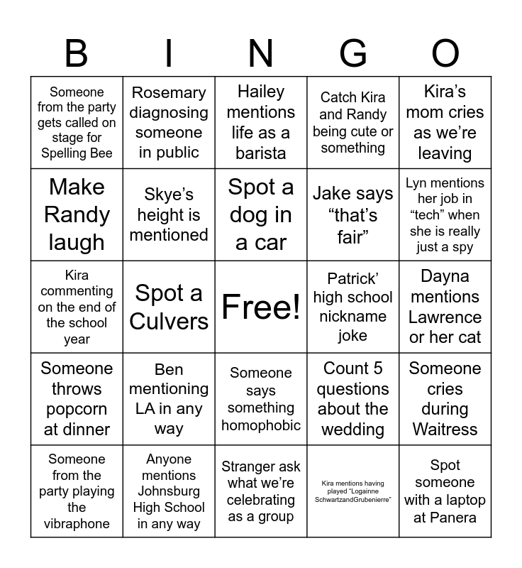 This bingo card has a free space and 24 words: Ben mentioning LA in any way, Anyone mentions Johnsburg High School in any way, Spot a dog in a car, Someone from the party playing the vibraphone, Kira’s mom cries as we’re leaving, Someone from the party gets called on stage for Spelling Bee, Make Randy laugh, Rosemary diagnosing someone in public, Patrick’ high school nickname joke, Someone says something homophobic, Jake says “that’s fair”, Kira commenting on the end of the school year, Count 5 questions about the wedding, Someone cries during Waitress, Skye’s height is mentioned, Kira mentions having played “Logainne SchwartzandGrubenierre”, Dayna mentions Lawrence or her cat, Hailey mentions life as a barista, Lyn mentions her job in “tech” when she is really just a spy, Spot a Culvers, Spot someone with a laptop at Panera, Someone throws popcorn at dinner, Catch Kira and Randy being cute or something and Stranger ask what we’re celebrating as a group.